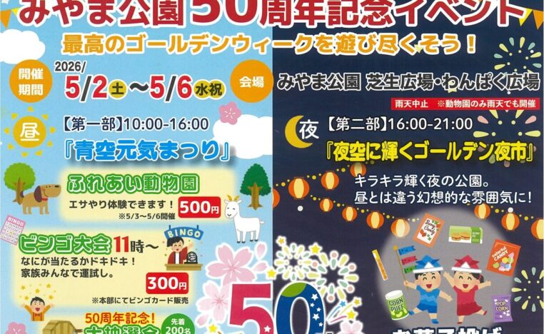 田井エリア みやま公園50周年記念イベント~最高のゴールデンウィークを遊び尽くそう!~ 2026.05.02 〜 2026.05.06 開催 ゴールデンウィークは、深山公園で子どもたちが喜ぶ催し物×みや…