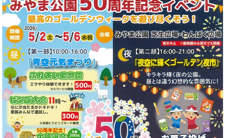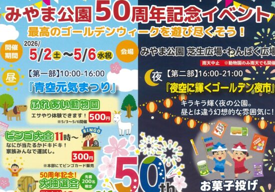 田井エリア みやま公園50周年記念イベント~最高のゴールデンウィークを遊び尽くそう!~ 2026.05.02 〜 2026.05.06 開催 ゴールデンウィークは、深山公園で子どもたちが喜ぶ催し物×みや…