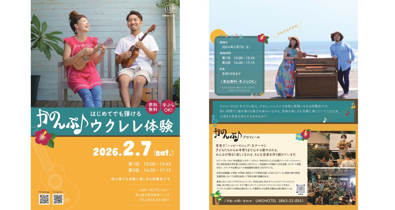 初心者の方でも安心して楽しめるウクレレ体験会を開催します。