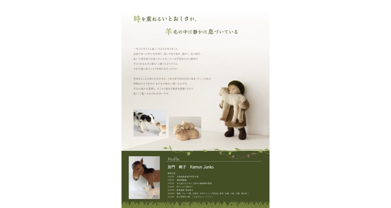 本展では、猫や牛、羊など、身近な動物たちを中心に、羊毛の質感と物語性が豊かに息づく作品をご覧いただけます。どうぞ、作品と心を通わせるようなひとときをお過ごしください。