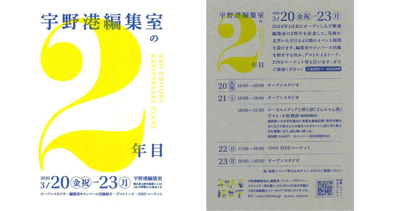 2024年1月末にオープンした宇野港編集室の2周年を記念して、気軽に見学いただける4日間のイベント期間を設けます。編集室やメンバーの活動を紹介するほか、ゲストによるトーク、ZINEマーケット等も行います。