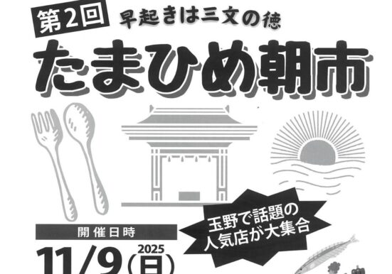 イベント EVENT イベントを条件検索 開催日 エリア カテゴリ 〜 選択した日付をリセット その他エリア 八浜エリア 宇野港周辺エリア 山田・東児エリア 日比エリア 渋川周辺エリア 玉周辺エリア 田井エリア 荘内エリア アート グルメ・物産 スポーツ・アウトドア 体験 祭り・伝統行事 自然・花 音楽 絞り込み検索 全8件中 8件表示 玉周辺エリア ファミリーコンサート 2025.11.09 開催 玉野ウインドオーケストラ 秋のみんなのコンサート玉野市を中心… 玉周辺エリア たまひめアートフェス 2025.11.08 開催 『たまひめアートフェス』~玉比咩神社でアートを楽しむ~千年以… 玉周辺エリア 第2回 たまひめ朝市 2025.11.09 開催 早起きは三文の徳!お肉や海産物、野菜にフルーツ、お弁当や軽食… 玉周辺エリア 第30回 玉野合唱祭 2025.10.26 開催 ∼出演団体~♪玉野市民女声合唱団♪ささゆり合唱団♪混声合唱団… 玉周辺エリア 第3回玉の輪祭り 2025.11.23 開催 玉野商工高校の生徒が企画する「玉の輪祭り」。3回目の今年は「… 玉周辺エリア 地域交流グラウンドゴルフ大会 2025.11.08 開催 『令和7年度玉野市コミュニティ協議会 地域交流グラウンドゴル… このイベントは終了しました 玉周辺エリア 第54回 玉野ギター・マンドリンクラブ 定期演奏会 2025.10.05 開催 【演奏曲目】この広い野原いっぱいオクラホマ・ミキサーロマン的… このイベントは終了しました 玉周辺エリア グルメフェス-三井生協和田店 2024.05.12 開催 三井生協和田店にて、「グルメフェス」開催します!!三井生協さ…