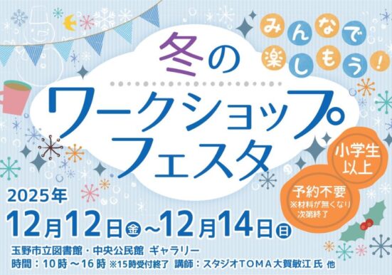 イベント EVENT イベントを条件検索 開催日 エリア カテゴリ 〜 選択した日付をリセット その他エリア 八浜エリア 宇野港周辺エリア 山田・東児エリア 日比エリア 渋川周辺エリア 玉周辺エリア 田井エリア 荘内エリア アート グルメ・物産 スポーツ・アウトドア 体験 祭り・伝統行事 自然・花 音楽 絞り込み検索 全70件中 12件表示 宇野港周辺エリア 冬のワークショップフェスタ 2025.12.12 〜 2025.12.14 開催 冬休みにモノづくりで楽しもう!◆講師:スタジオTOMA 大賀… 宇野港周辺エリア わくわく無料体験フェスタ 2025.11.29 開催 玉野競輪場(岡山県玉野市、運営:株式会社チャリロト)は、20… 宇野港周辺エリア UNO HOTEL 企画展 第1章 Dear Someone ー誰かを想うー 第2章 はじまりのかたち 工芸と書 2025.12.07 〜 2026.02.13 開催 UNO HOTELではふたつの章からなる企画展を開催いたしま… 宇野港周辺エリア 香害ってなんじゃろ?in OKAYAMA ~不安虫ちゃんの参加型パネル展2025 2025.12.10 〜 2025.12.23 開催 香害(こうがい)ってご存じですか?柔軟剤や消臭スプレー、除菌… このイベントは終了しました 宇野港周辺エリア 書道ライブパフォーマンス「海の恵みと芸術の旅」 2025.11.23 開催 地元出身の書道家・萌愛(もあ)氏によるライブパフォーマンスイ… このイベントは終了しました 宇野港周辺エリア SETOUCHI CONTEMPORARY 2025 2025.11.15 〜 2025.11.16 開催 玉野市で初めて開催される野外フェス『せとうちコンテンポラリー… このイベントは終了しました 宇野港周辺エリア みんな笑顔でユニバーサルデザイン落語会 2025.11.22 開催 『みんな笑顔でユニバーサルデザイン落語会』~世代も障害もこえ… このイベントは終了しました 宇野港周辺エリア 小学生かるた大会 2025.11.08 開催 玉野市立図書館 秋の読書週間の企画の一つ「小学生かるた大会」… このイベントは終了しました 宇野港周辺エリア エンディングノート活用講座 2025.11.07 開催 未来の安心は今日の一歩から~今後の時間を自分らしく~ 『エン… このイベントは終了しました 宇野港周辺エリア アメリカンフェス in TAMANOKEIRIN 2025.10.18 開催 週末を自由に楽しむ「アメリカンフェス」開催!― BBQ・車両… このイベントは終了しました 宇野港周辺エリア 勾玉づくりワークショップ 2025.11.09 開催 古代の出土品を学びながら、当時のアクセサリー(装身具)を作っ… このイベントは終了しました 宇野港周辺エリア 市電とバスまつり2025 2025.11.23 開催 ・市電廃線跡と交通遺産めぐり ー 宇高連絡船、国道フェリーの… 1 2 3 … 6