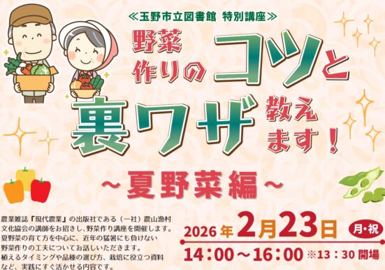 イベント EVENT イベントを条件検索 開催日 エリア カテゴリ 〜 選択した日付をリセット その他エリア 八浜エリア 宇野港周辺エリア 山田・東児エリア 日比エリア 渋川周辺エリア 玉周辺エリア 田井エリア 荘内エリア アート グルメ・物産 スポーツ・アウトドア フォーラム 体験 祭り・伝統行事 自然・花 講演 音楽 絞り込み検索 全4件中 4件表示 宇野港周辺エリア 特別講座『野菜作りのコツと裏ワザ教えます!』 2026.02.23 開催 農業雑誌「現代農業」の出版社、(一社)農山漁村文化協会 金子… 宇野港周辺エリア 玉野こころの講演会『睡眠からはじまるメンタルヘルス~より良い睡眠をとるために~』 2026.02.14 開催 新見公立大学教授井上真一郎氏が睡眠とストレス、心の健康につい… 渋川周辺エリア 第34回 西行まつり 2026.03.08 開催 西行法師が渋川の海岸に立ち寄ったという古事にちなんで開催され… このイベントは終了しました 玉周辺エリア 新春講演会『気候変動の時代 天気予報で生きのびる!』 2026.02.01 開催 気象予報士/防災士 勝丸恭子氏を講師に迎え、『気候変動の時代…