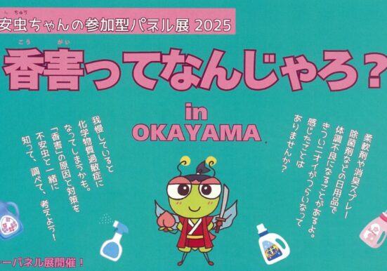 宇野港周辺エリア 香害ってなんじゃろ?in OKAYAMA ~不安虫ちゃんの参加型パネル展2025 2025.12.10 〜 2025.12.23 開催 香害(こうがい)ってご存じですか?柔軟剤や消臭スプレー、除菌…