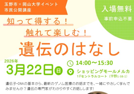 イベント EVENT イベントを条件検索 開催日 エリア カテゴリ 〜 選択した日付をリセット その他エリア 八浜エリア 宇野港周辺エリア 山田・東児エリア 日比エリア 渋川周辺エリア 玉周辺エリア 田井エリア 荘内エリア アート グルメ・物産 スポーツ・アウトドア フォーラム 体験 祭り・伝統行事 自然・花 講演 音楽 絞り込み検索 全54件中 12件表示 宇野港周辺エリア 知って得する!触れて楽しむ!遺伝のはなし 2026.03.22 開催 遺伝子・DNAの基本から、最新のゲノム医療のお話までを、一緒… 渋川周辺エリア 渋川マリン水族館 3月ふれあいデー 2026.03.01 〜 2026.03.29 開催 3月のふれあいデーは「エイ・サメふれあいワークショップ」です… 宇野港周辺エリア バリアフリー映画上映会『お終活 再春!』 2026.03.15 開催 ~バリアフリー映画とは?~普通の映画に字幕や音声ガイドを付け… 日比エリア 明神鼻茶会 2026.03.28 開催 大槌島の山桜を愛でながら、心和むひとときを一期一会の皆様を、… このイベントは終了しました 宇野港周辺エリア しいたけ菌 植え付け体験 2026.02.15 開催 しいたけ菌を原木に植え付けて、育ててみませんか?どなたでも参… 渋川周辺エリア 第34回 西行まつり 2026.03.08 開催 西行法師が渋川の海岸に立ち寄ったという古事にちなんで開催され… このイベントは終了しました 宇野港周辺エリア 第2弾!冬のワークショップフェスタ 2026.02.21 〜 2026.02.22 開催 モノづくりイベント第2弾を二日間にわたって開催します!◆講師… このイベントは終了しました 渋川周辺エリア 渋川マリン水族館 2月ふれあいデー「アザラシふれあい体験」 2026.02.01 〜 2026.02.22 開催 2月のふれあいデーは「アザラシふれあい体験」ですアザラシを近… このイベントは終了しました 玉周辺エリア パパと子どもの防災大作戦 ~めざせ!防災マイスター~ 2026.01.31 開催 1月31日(土曜日)にすこやかセンターにて、本年度3回目の子… このイベントは終了しました その他エリア 晴れの国おかやま 春の移住フェア in 大阪 2026.02.08 開催 JR大阪駅から徒歩3分の会場で、移住に関する個別相談会やセミ… このイベントは終了しました 渋川周辺エリア 渋川マリン水族館「おさかなエサやり体験」 2026.01.11 〜 2026.01.25 開催 1月のふれあいデーは「おさかなエサやり体験」です今回の餌やり… このイベントは終了しました 宇野港周辺エリア 『晴れ育-ハレイク』~笑顔で子育て!子育てプロの豊富なアイデアで子どもと思いきり遊んじゃおう!~ 2026.02.01 開催 子育て中のみなさん! 2月1日はショッピングモールメルカ1階… 1 2 3 … 5