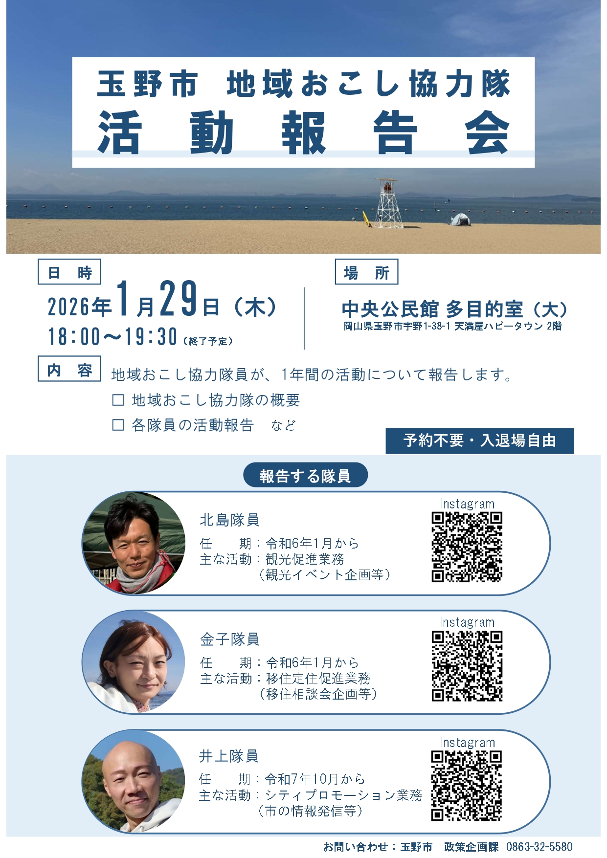 玉野市 地域おこし協力隊 活動報告会 2025.12.16 お知らせ 現在玉野市で活動している「玉野市地域おこし協力隊」3名の隊員の活動報告会を開催いたします。 地域おこし協力隊の概要、各隊員の活動報告など 予約不要・入退場自由となっておりますので、皆様お気軽にご参加ください。 日時:2026年1月29日(木) 18:00~19:30(終了予定) 場所:中央公民館 多目的室(大)(玉野市宇野1-38-1 天満屋ハピータウン メルカ2階) お問合せ:玉野市 政策企画課 (0863-32-5580) この投稿の掲載者 公益社団法人 玉野市観光協会 706-0002岡山県玉野市築港1-1-3 産業振興ビル1F TEL 0863-21-3486 FAX 0863-32-3331 前の記事へ 次の記事へ